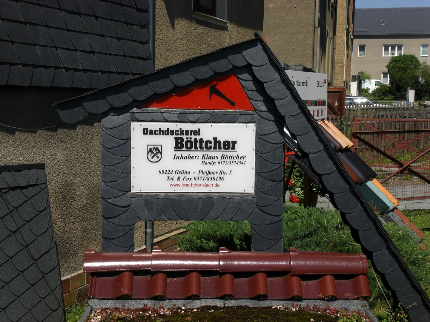 Das stilvoll mit Schiefer verkleidete Wohnhaus ist eines der ältesten in Grüna. Meisterhaft wurde der 6-eckige Schornstein sowie das Dachdeckeremblem in Schiefer eingedeckt. Dieser Anblick lädt manchen Spaziergänger zum Staunen ein.